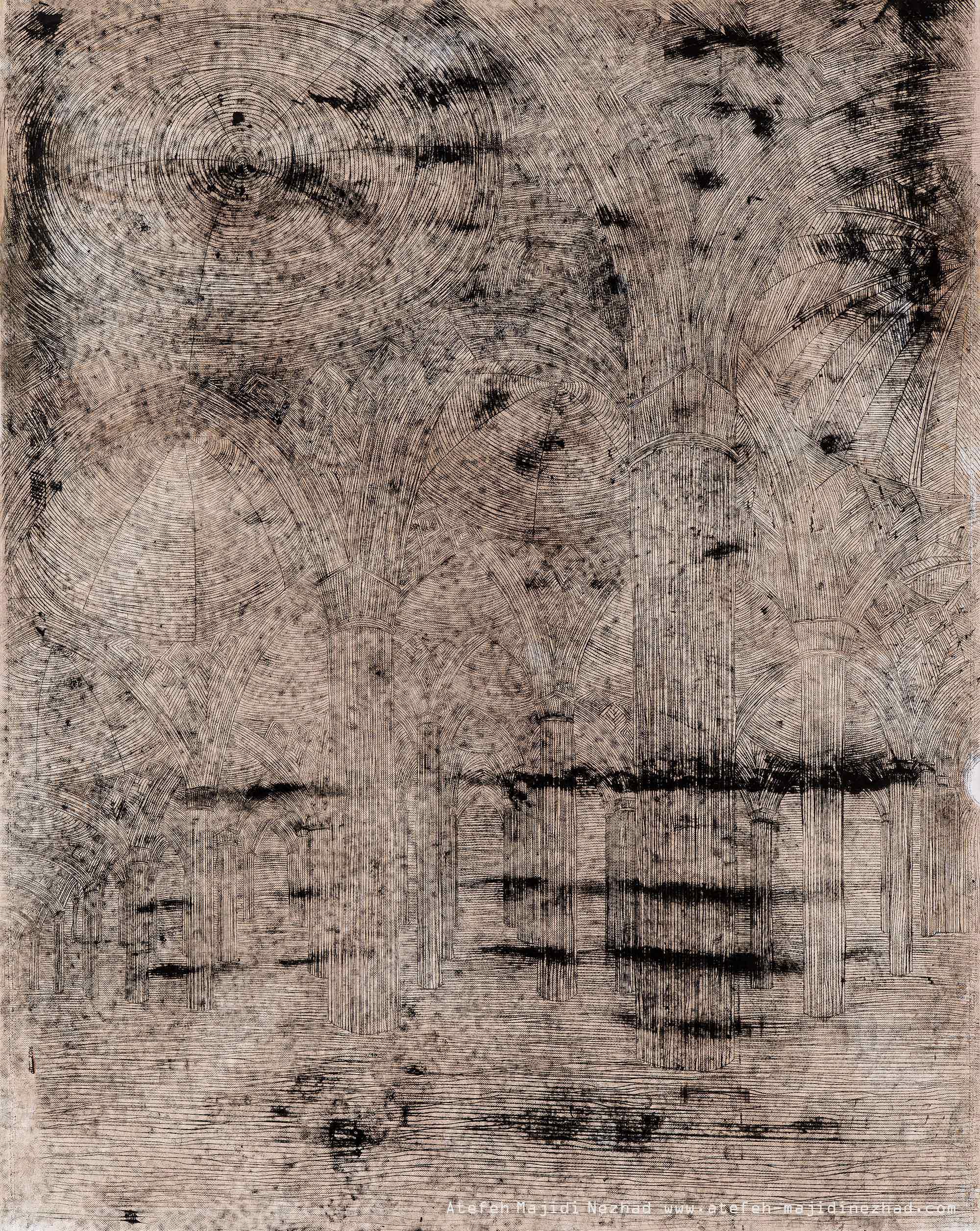 The work on the ongoing series started in 2015 with the title “Iwan of Conditional Configuration.” It initially aimed to explore the architecture of organized ideology and man-made systems. By using repeating lines and their interaction with the media.