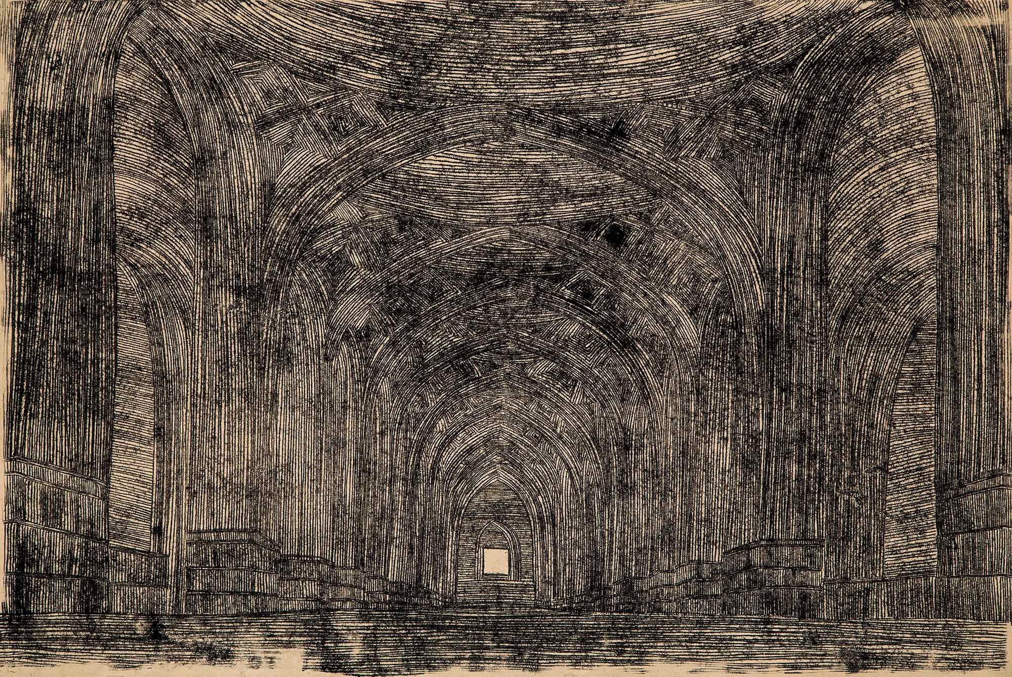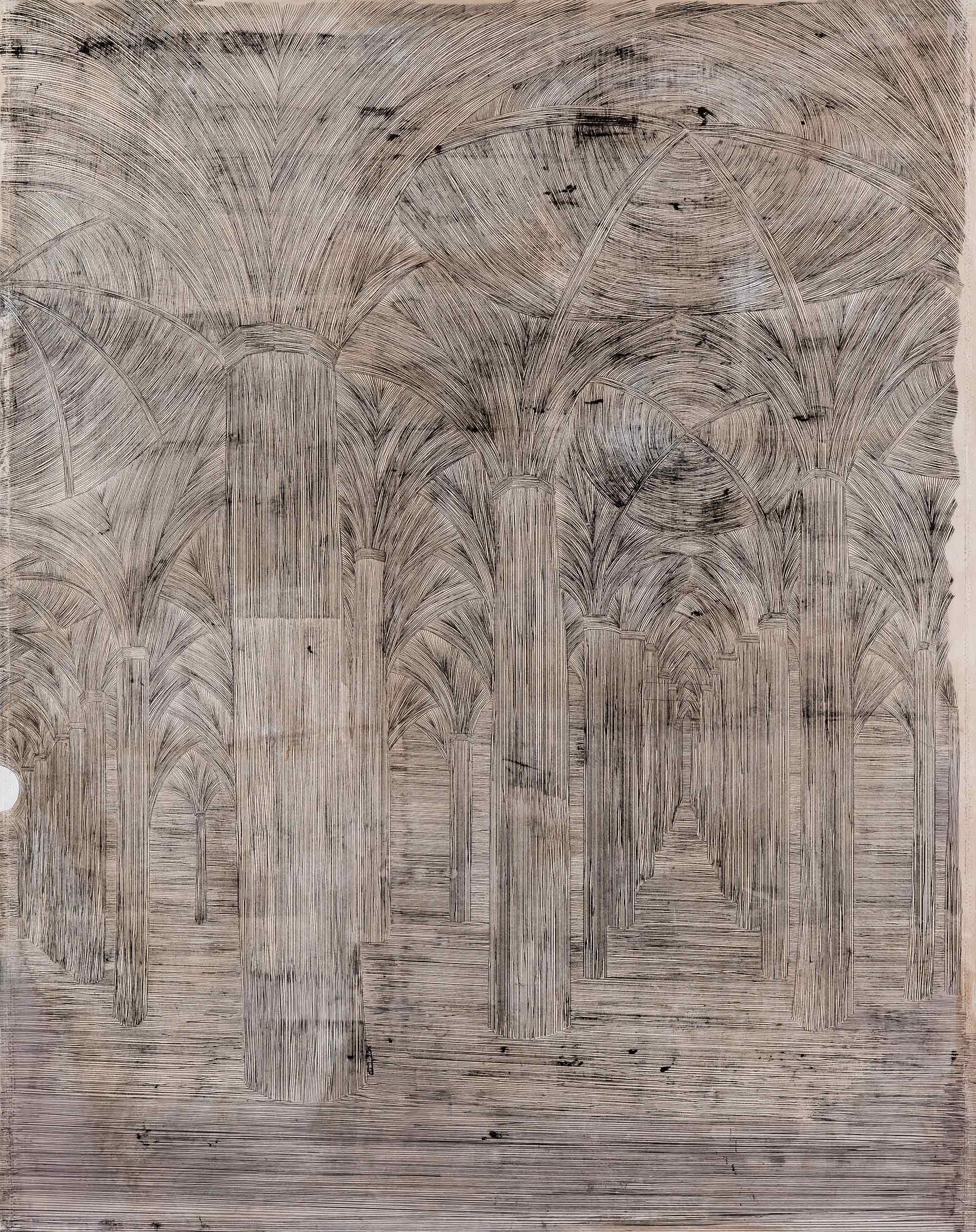 It raises inquiries about how architecture employs repetition and linear perspective to shape the experiences of its inhabitants. The use of the monotype technique allows for the preservation of handprint characteristics, without any alterations.